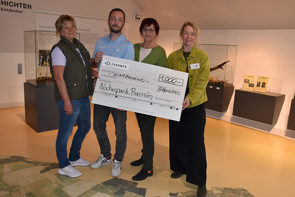 Beate Kerkhofer (1. Vorsitzende Schönower-Heide-Verein e. V.), Robert Müller (SCC EVENTS), Petra Bierwirth (Vorsitzende Förderverein Naturpark Barnim e. V.) und Dr. Aija Torkler (Naturparkleiterin Naturpark Barnim) bei der Scheckübergabe (v. l. n. r.). © SCC EVENTS / Naturpark Barnim